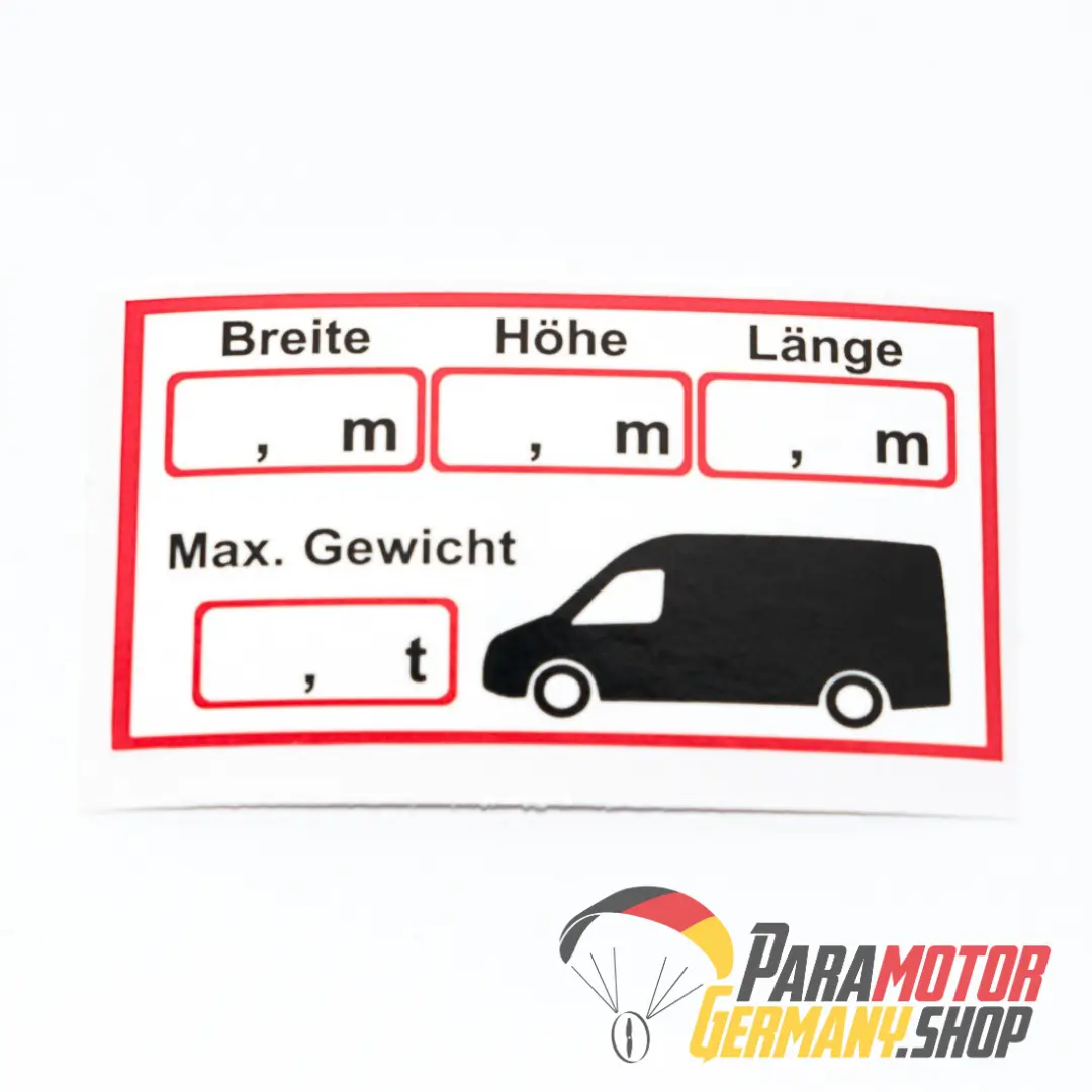 Auf diesem Aufkleber kannst Du problemlos mit einem Folienstift die Maße und das Gewicht deines Kastenwagens / Wohnmobils in die Länge, Breite, Höhe und Gesamtgewicht Felder eintragen.