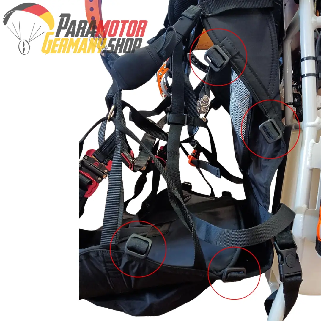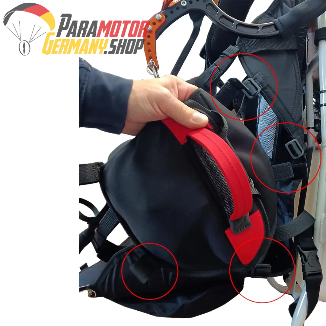 Neopren Rettungscontainer zur seitlichen Montage am FlyProducts Comfort-Gurtzeug welches Standardmäßig am Rider Rahmen und auf Wunsch auch am Eclipse Rahmen verbaut werden kann.